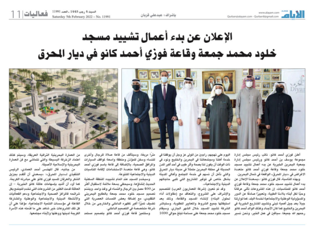 Arab Architects is proud to have been appointed to design and supervise the construction of Kholoud Mohammad Juma Mosque and Fawzi Ahmed Kanoo Hall in Diyar Al Muharraq, after fulfilling all the required standards. The 1690sqm mosque will consist of a prayer hall for men and another for women, a residence for the muezzin, a large car parking area and health facilities. In addition to Fawzi Ahmed Kanoo Hall, which is a multi-use hall for holding various religious and social events.